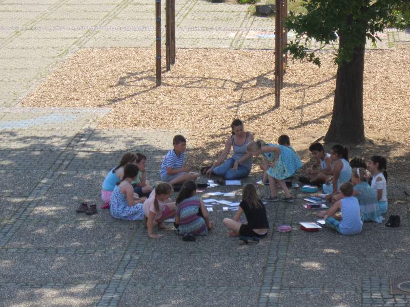 sucht die Klasse 2D mit ihrer Lehrerin Schutz im Schatten des großen Ahornbaumes auf dem Schulhof. So kann man auch einen kühlen Kopf
