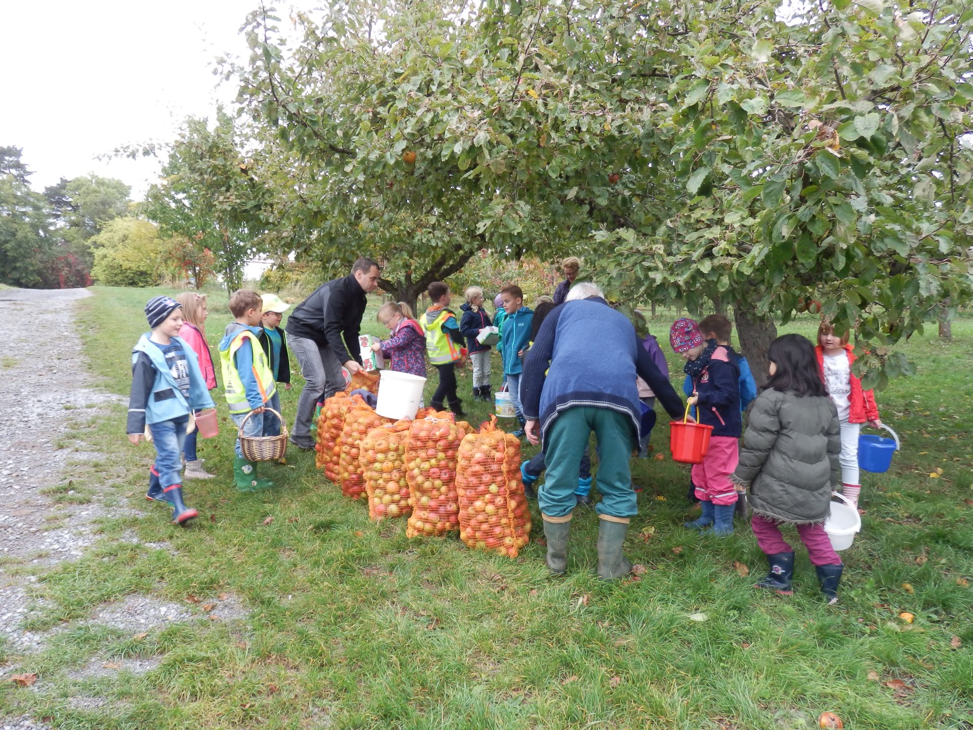 Kirchengemeinde später in der Kelter gepresst werden sollten. Über eine Stunde sammelten fleißige kleine Hände Äpfel in Eimer, schütteten sie in Säcke
