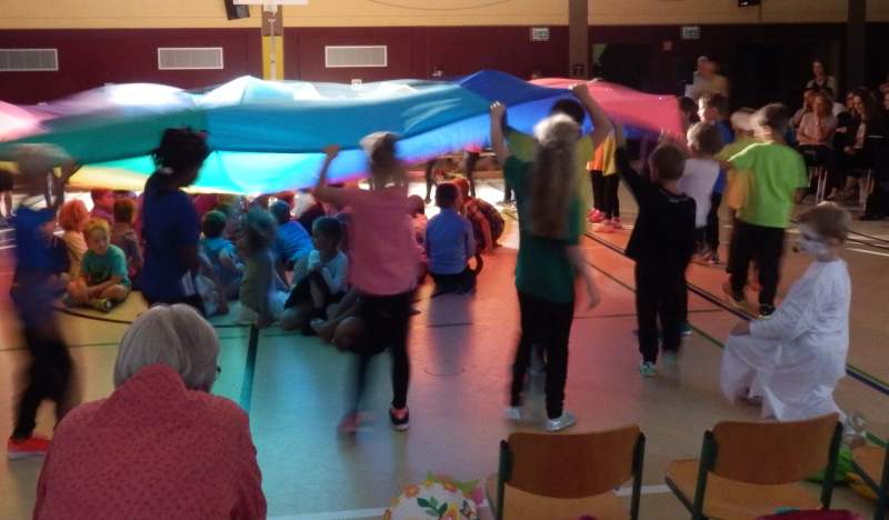 Zum Schluss wurden die Erstklässler unter den großen bunten Fallschirm eingeladen und mit einem vergnügten Lied in der Schulgemeinschaft