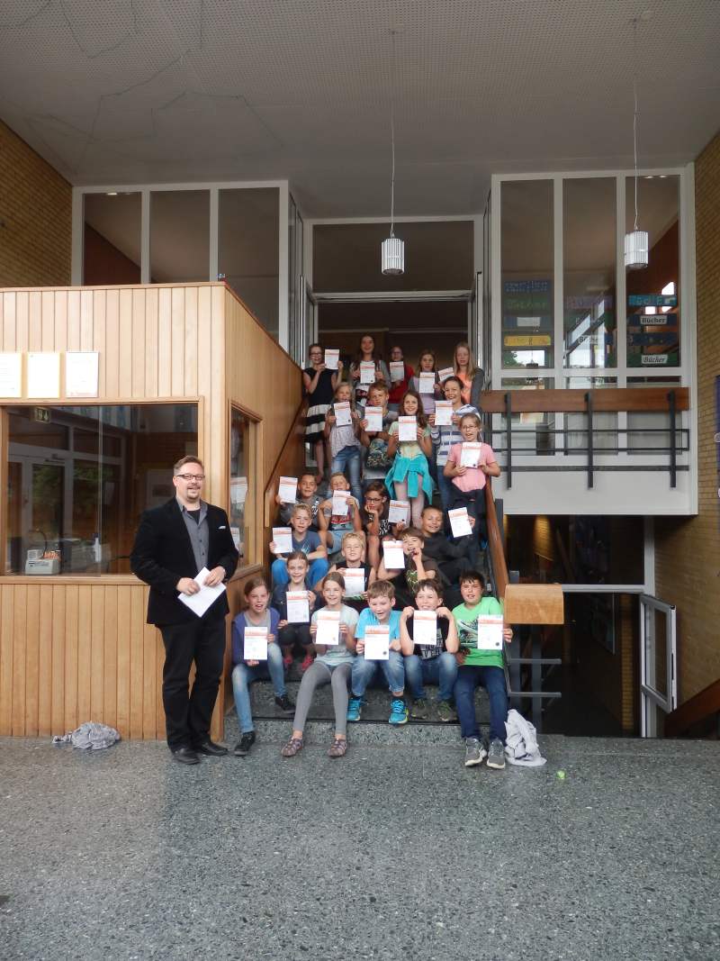 Gespannt lauschten die Kinder, als der Rektor, Herr Blobel, die Namen der Schüler vorlas, die eine Ehrenurkunde